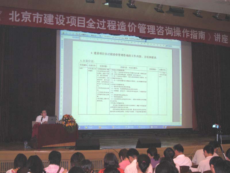北京市建設(shè)工程造價管理處和北京市建設(shè)工程造價管理協(xié)會委托我公司董事長周和生起草的《北京市建設(shè)項目全過程造價管理咨詢操作指南》(以下簡稱《指南》),經(jīng)北京市部分咨詢企業(yè)負(fù)責(zé)人、專家教授多次研討,完成了指南的送審稿,并下發(fā)通知在北京市施行,作為北京市工程造價咨詢機(jī)構(gòu)接受委托對建設(shè)項目實施全過程造價管理咨詢時所遵循的指導(dǎo)性依據(jù)。建設(shè)單位、施工單位等可參照執(zhí)行?!?br /> 為更好的貫徹落實《指南》的執(zhí)行,2007年8月8日,由北京市建設(shè)工程造價管理協(xié)會組織,在中國建筑科學(xué)研究院禮堂舉辦了《北京市建設(shè)項目全過程造價管理咨詢操作指南》講座,對全市三百多家工程造價咨詢企業(yè)進(jìn)行《指南》的宣貫,由公司董事長周和生對《指南》的操作作了全面的介紹和重點的講解。