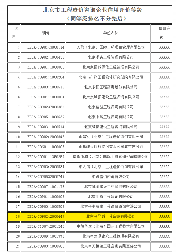 公司榮獲“北京市工程造價(jià)咨詢企業(yè)信用評(píng)價(jià)5A級(jí)企業(yè)”